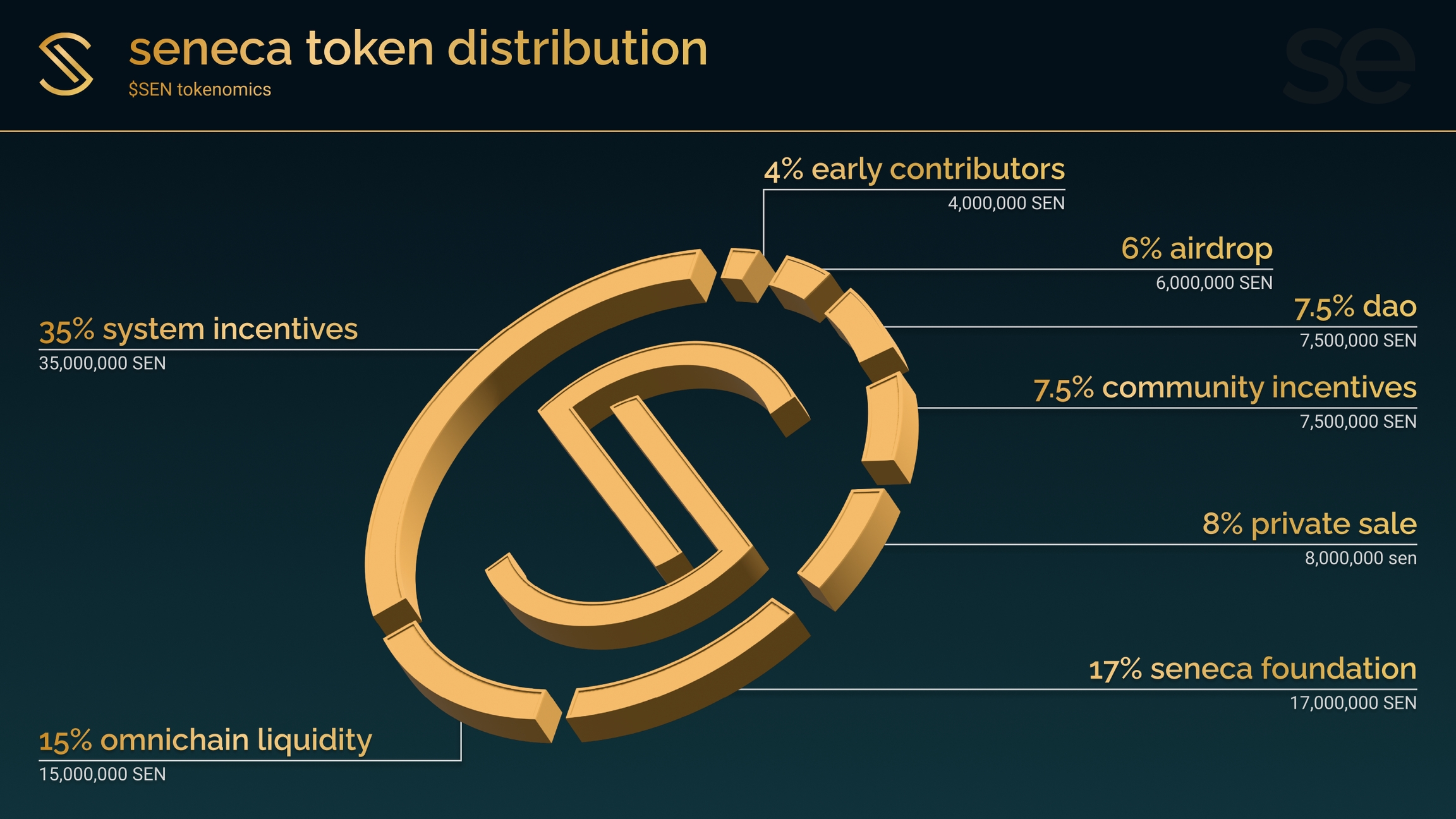 SEN is the native token of Seneca Protocol. It is an ERC-20 token with a maximum supply of 100,000,000 tokens.